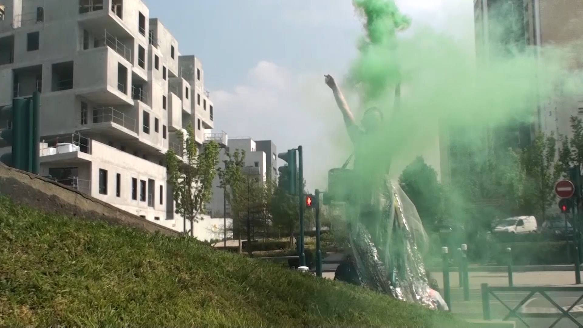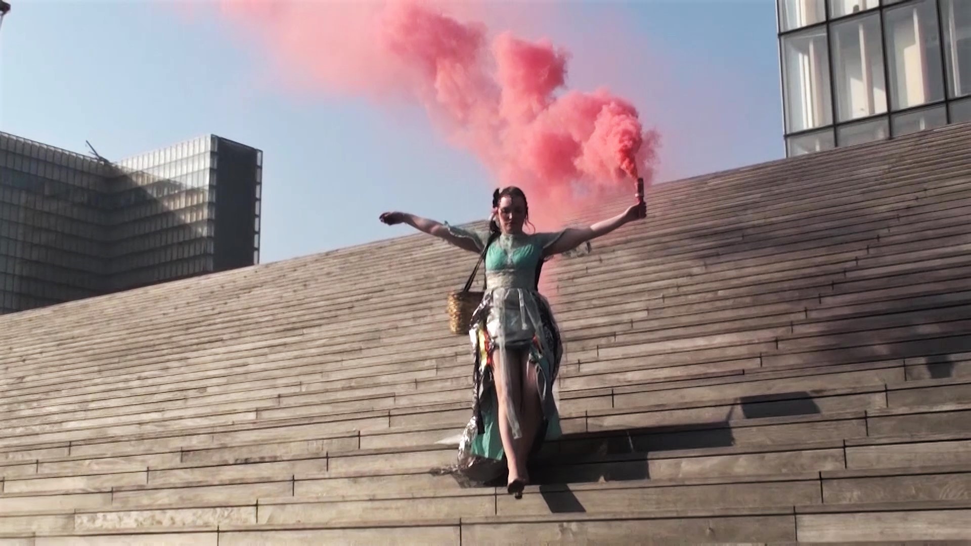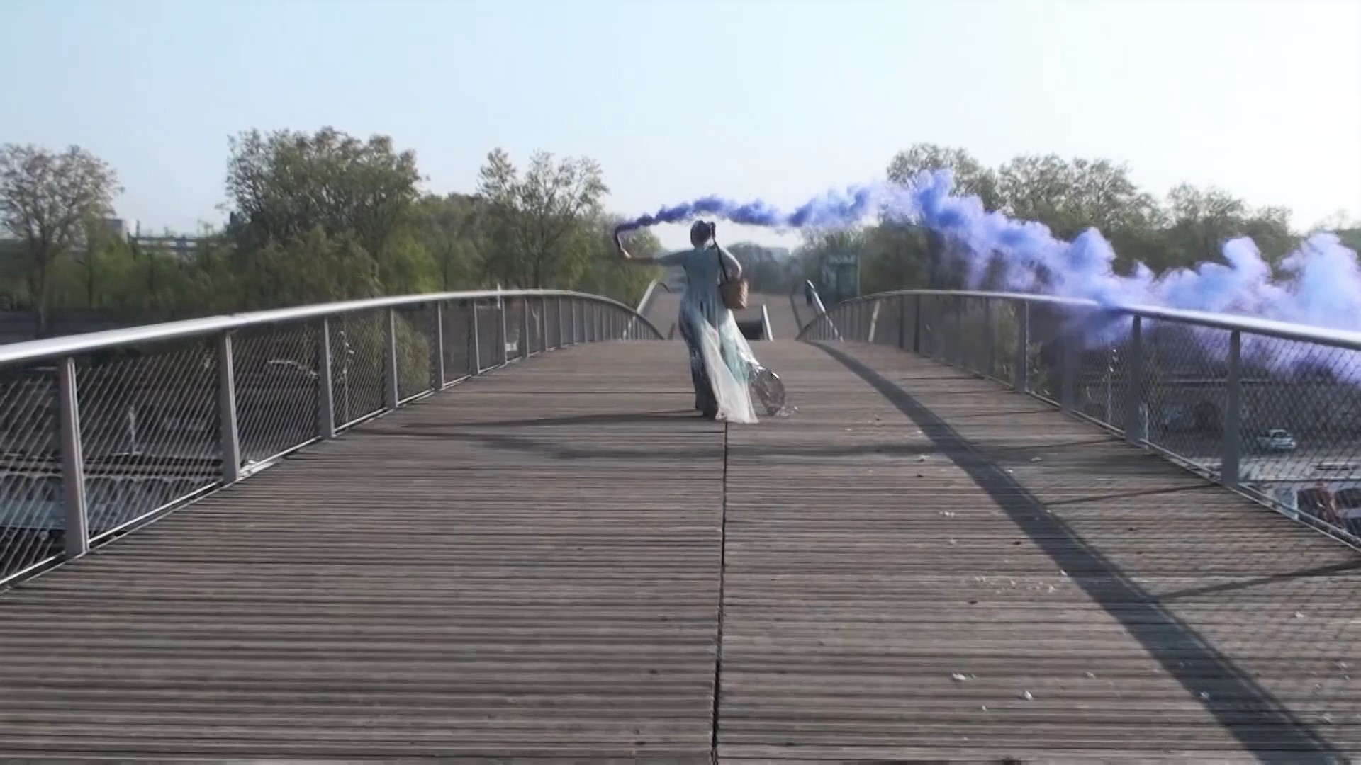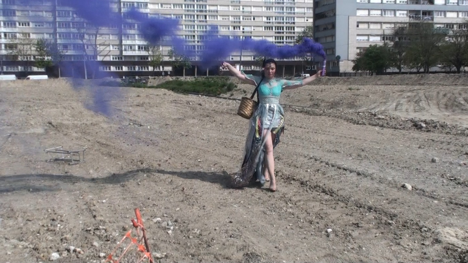 lei stessa a mano) e mentre cammina con una mano sparge petali di fiori freschi (prese da un cesto di vimini) per le strade di cemento e con l'altra tiene alto un fumogeno colorato. Un contrasto