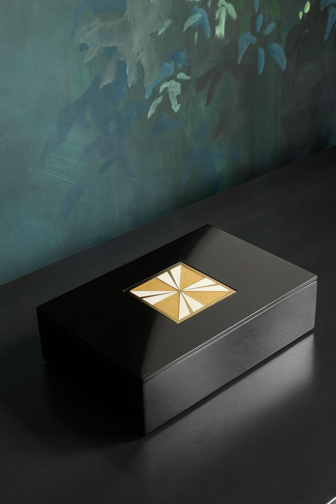 La Scatola Cloisonné in Lacca, dalle proporzioni impeccabili, accosta la profondità della lacca nera lucida all'intarsio vibrante dello smalto cloisonné, finemente inciso e realizzato a mano da