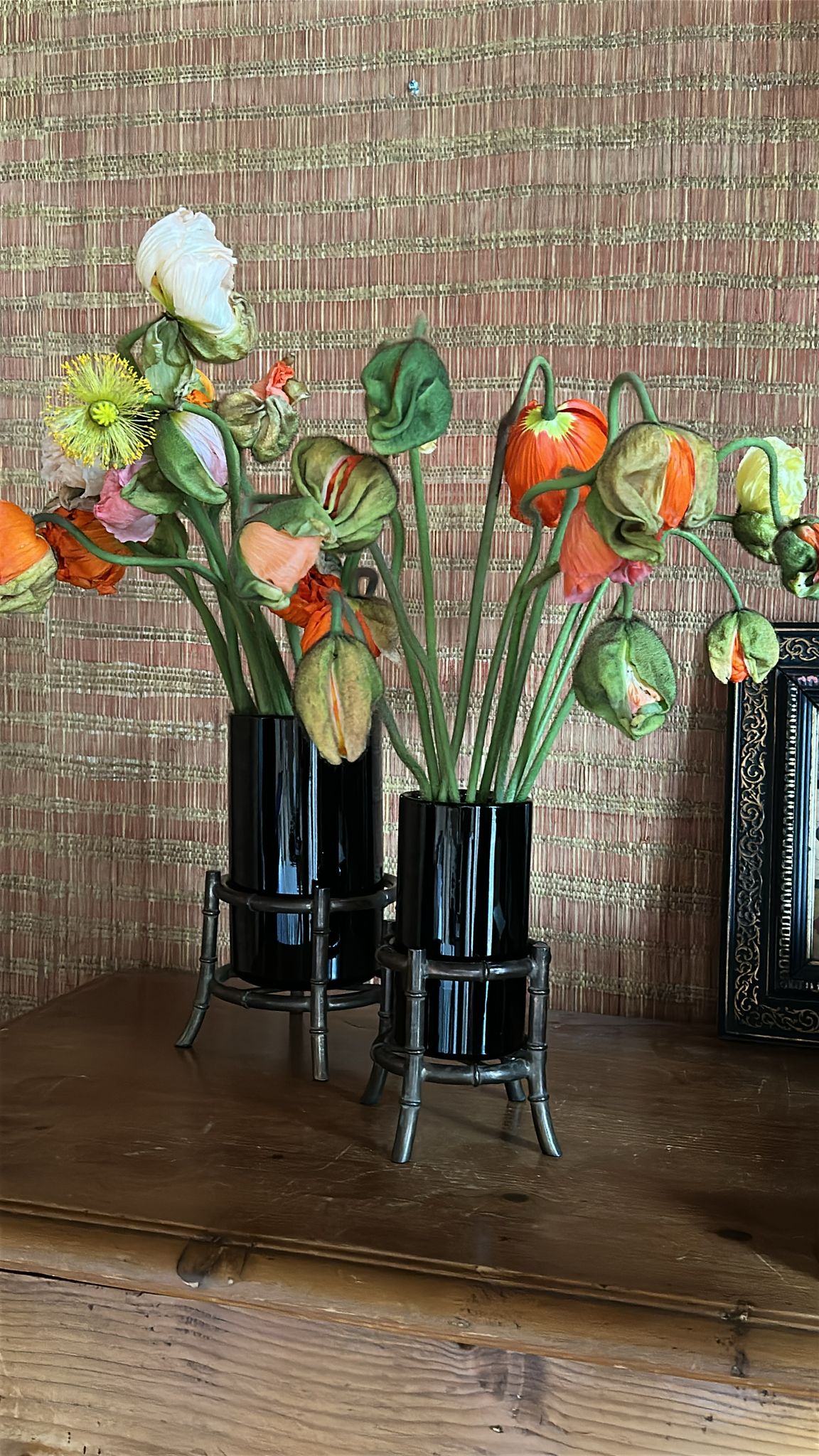 La capsule di Vasi Cloisonné realizzata in una storica fornace di Murano, esplora l'incontro tra la profondità del vetro nero soffiato e la brillantezza dello smalto cloisonné applicato su