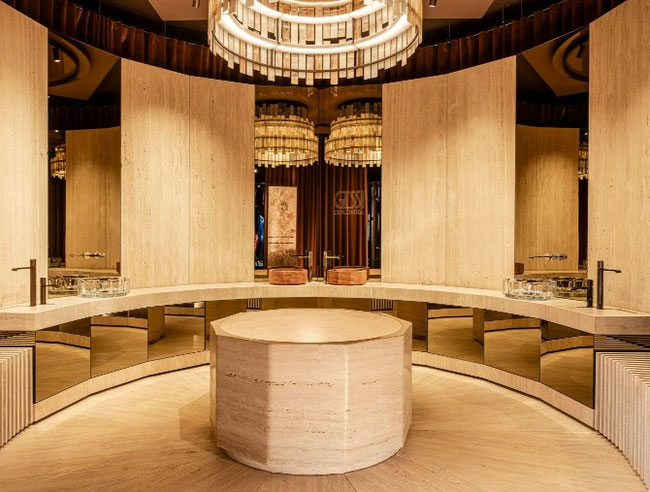 In una scenografia firmata Rockwell, tra cristalli, travertini e metalli plasmati come gioielli, il bagno si trasforma in un teatro dell'anima.