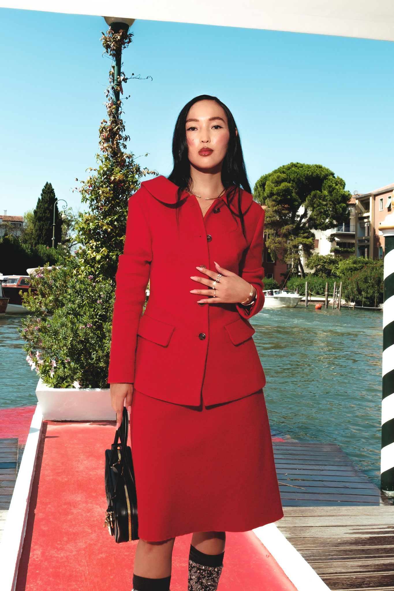 Per il suo arrivo Korland Madi ha indossato una collana rigida aperta (oro giallo 18kt e 2 diamanti naturali taglio brillante forma cuore), bracciali rigidi aperti (oro