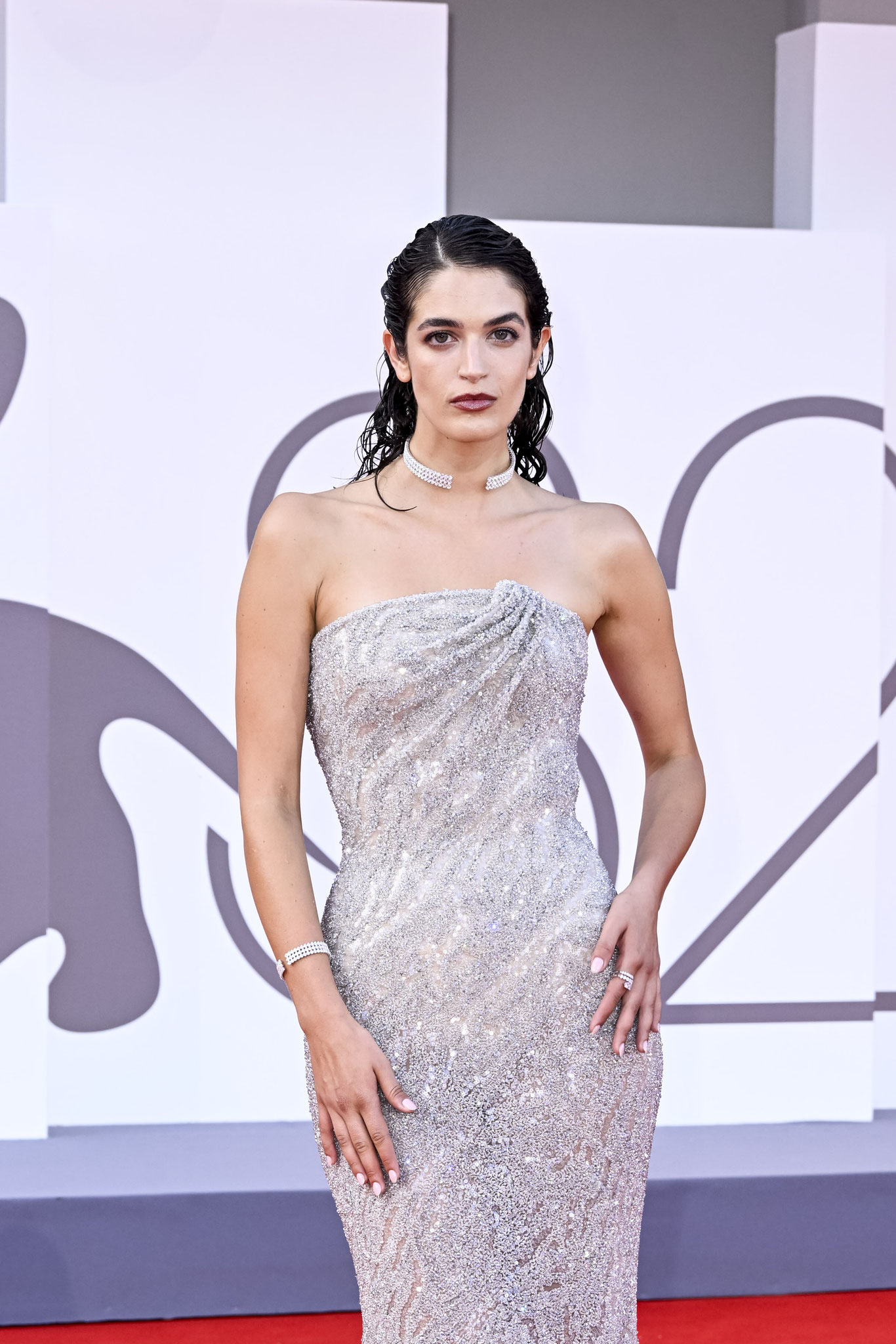 Invece per il red carpet ha indossato una parure composta da: un anello contrarié (oro bianco 18 kt e diamanti naturali taglio brillante forma cuore), choker a tre file (oro bianco 18kt e